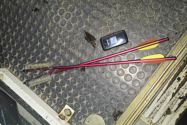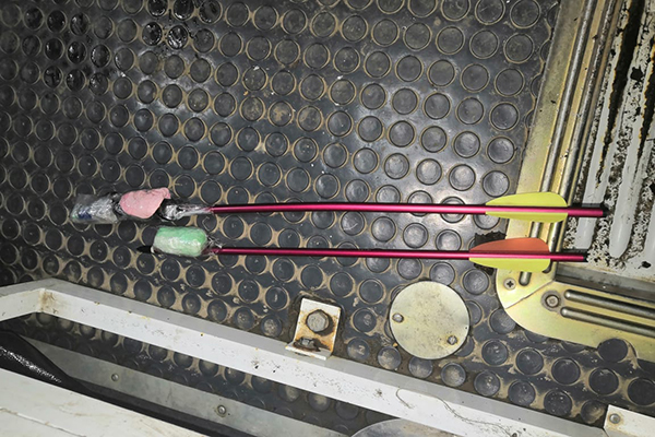 В ходе досмотра у задержанных обнаружили и изъяли арбалет и четырьмя стрелами. К стрелам накрепко скотчем были примотаны полимерные свёртки с наркотическими веществами, вес которых составил 18,20 г марихуаны и 19,56 г амфетамина. Сами стрелки и их «посылки» были переданы сотрудникам полиции.