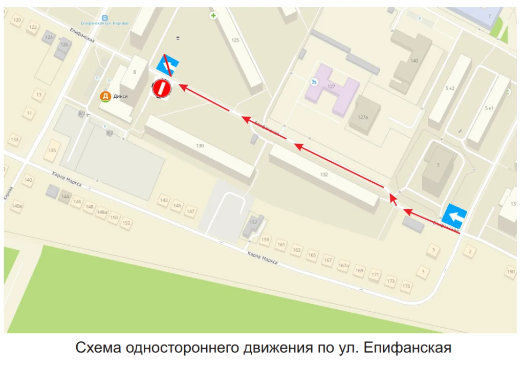 С 30 апреля на участке от ул. Калинина до дома № 8 по ул. Кирова будет организовано одностороннее движение. Введение таких должно исключить конфликтные точки между участниками дорожного движения и увеличить пропускную способность улично-дорожной сети на ул. Епифанской. Об этом информирует Управление транспорта и дорожного хозяйства администрации города.