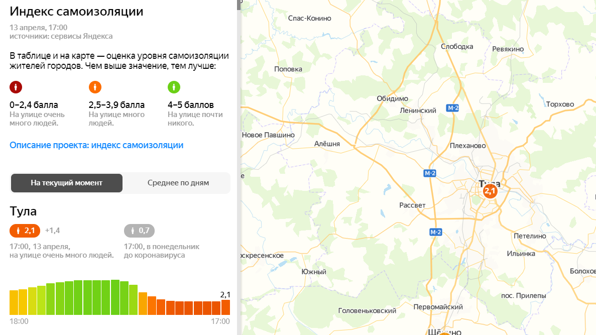 На сегодняшний вечер, 13 апреля, «индекс самоизоляции» составил 2,1 балла. То ли самоизоляция не по силам тулякам, то ли вера в себя и сказку, но бывший страх “заразиться” теперь уже перестает быть актуальным для жителей региона.