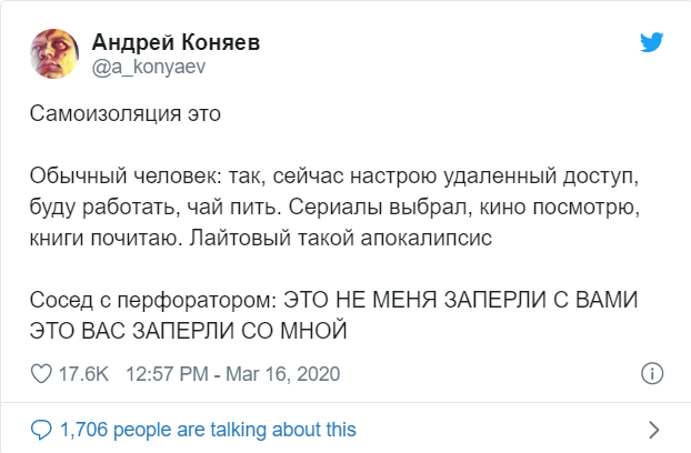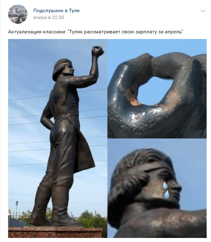 Напомним, что с 6 апреля многие предприятия в Туле и области уже вошли в рабочий режим, а с 9 апреля больше 20 тульских предприятий снова запустили свое производство. Однако, даже возобновленный рабочий режим в непростой эпид обстановке не смог “убить” чувство юмора туляков. Так, в социальных сетях жителей области начало появляться все больше и больше шуток и мемов про звезду этого времени - коронавирус.