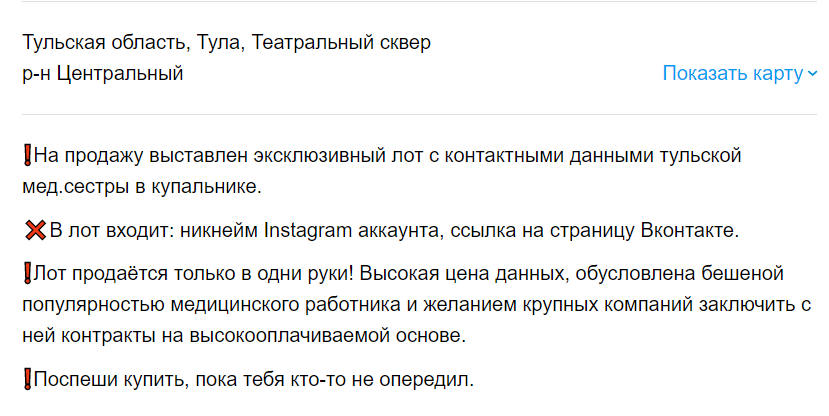 На одном из сайтов бесплатных объявлений появилось эксклюзивное предложение на миллион - продажа контактов тульской медсестры в купальнике.