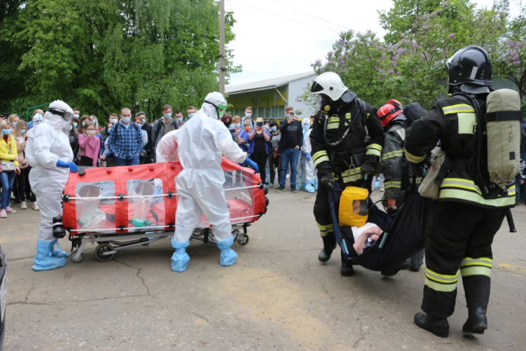 До прибытия подразделений медики самостоятельно вывели большую часть пациентов. По замыслу тренировки два человека остались в задымленном помещении госпиталя. Обоих пострадавших спасли с помощью спасустройств и передали скорой помощи. Одна из пострадавших была помещена в биобэг – мобильную камеру-бокс для транспортировки инфицированных больных.