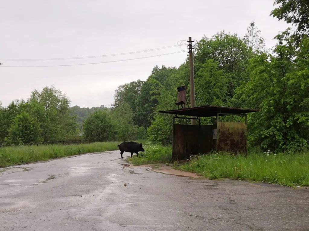 В Щекинском районе возле д. Селиваново местные жители заметили двух кабанов, выходящих на дорогу из леса. Животные прогулялись возле автобусной остановки, не обращая внимания на людей.