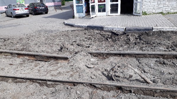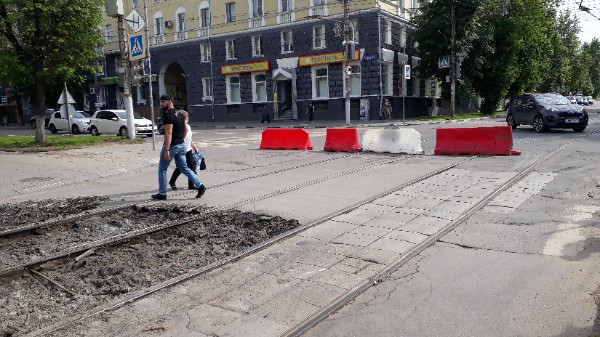 Сейчас работы идут по улице Ф.Энгельса от ул.Первомайской до ул.Льва Толстого. Спецтехника демонтирует старые рельсы и их основание, а аткже вытаскивают плиты.