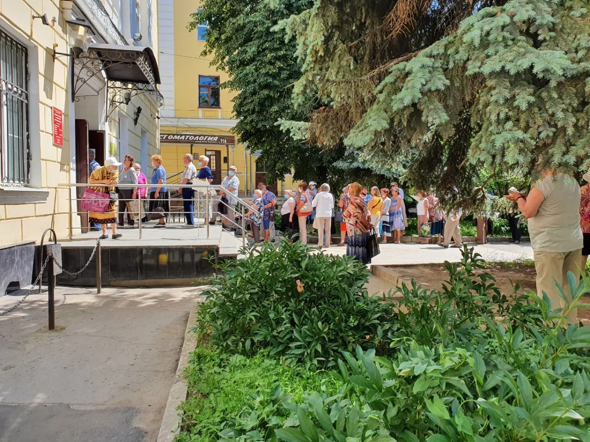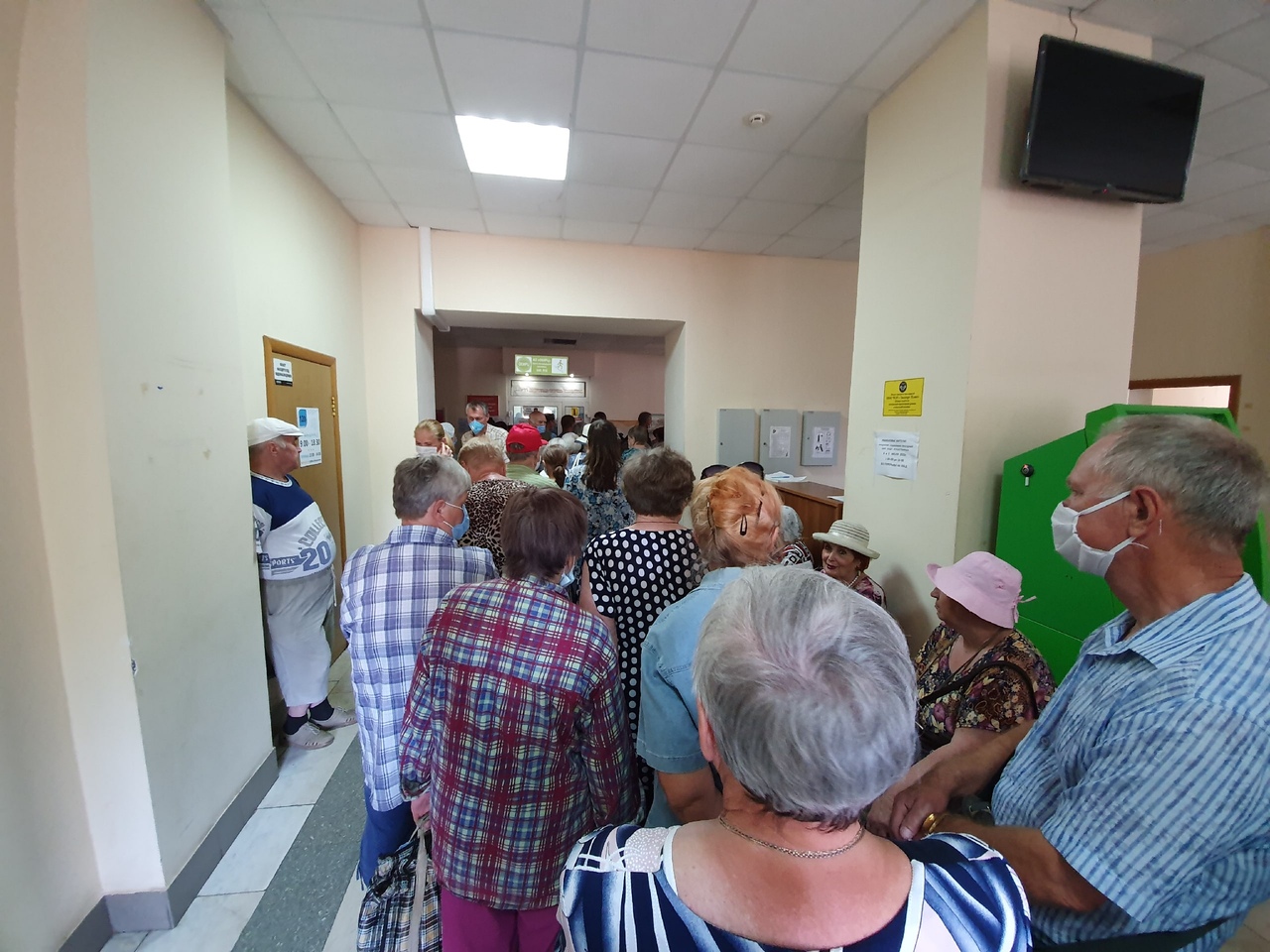 Пожилые люди столпились в огромную очередь, на улице находятся больше 50 человек, в здании еще столько же. Все стоят в масках и это в 30-градусную жару. Граждане недовольны, многим приходится стоять в очереди несколько часов.