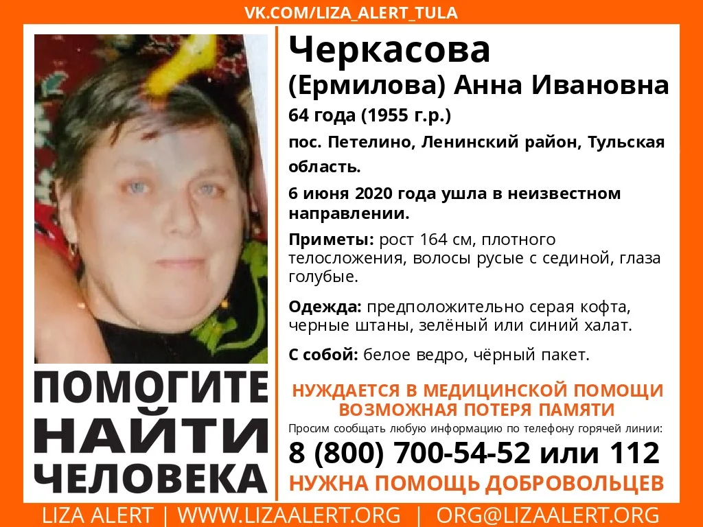 Волонтёры из отряда «Лиза Алерт» просят помощи в нахождении 64-летней жительницы Тульской области. Зовут пропавшую Черкасова (Еремина) Анна Ивановна, проживает в пос.Петелино.