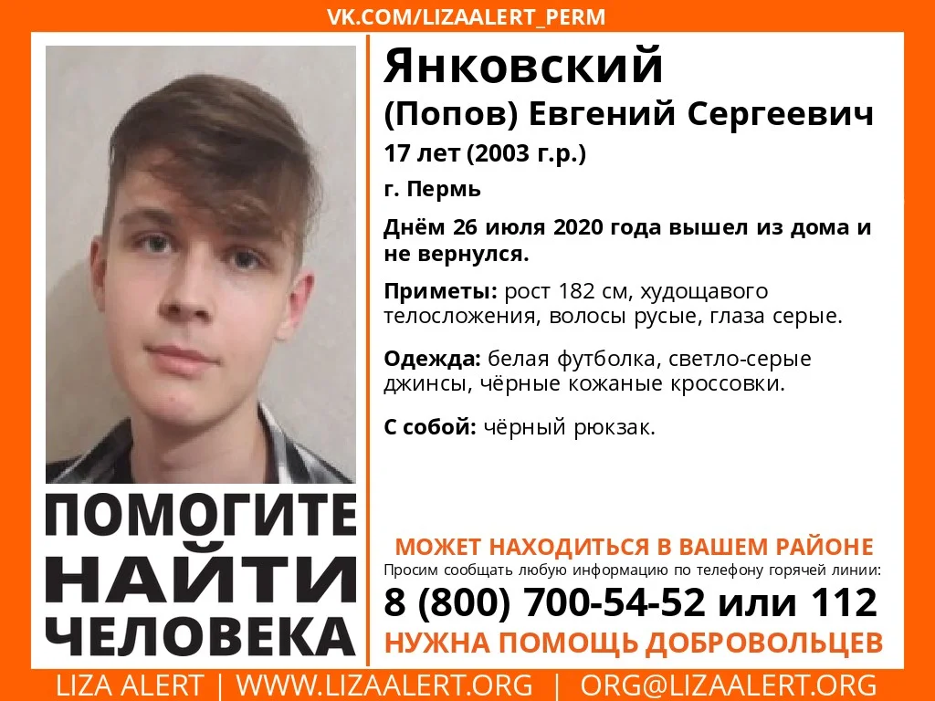 Янковский (Попов) Евгений Сергеевич, 17-летний подросток из Перми, днем 26 июля 2020 года вышел из дома и до сих пор не вернулся. Сообщается, что юноша может находиться в Тульской области.