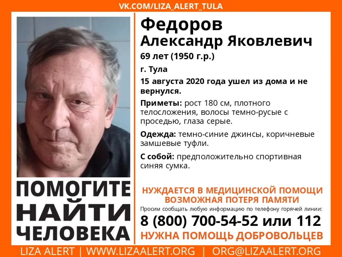 В Туле пропал 69-летний пенсионер. 15 августа 2020 года Федоров Александр Яковлевич ушел из дома и не вернулся.
