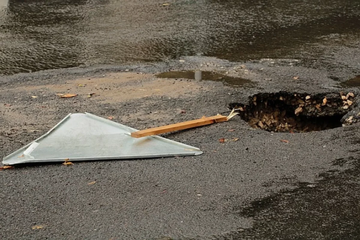 На месте провала был выставлен дорожный знак, но его, вероятно, сбили проезжающие мимо автомобили.