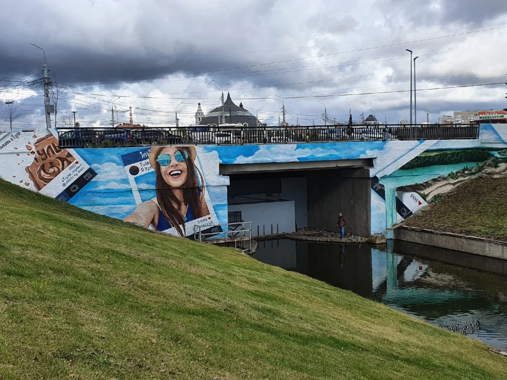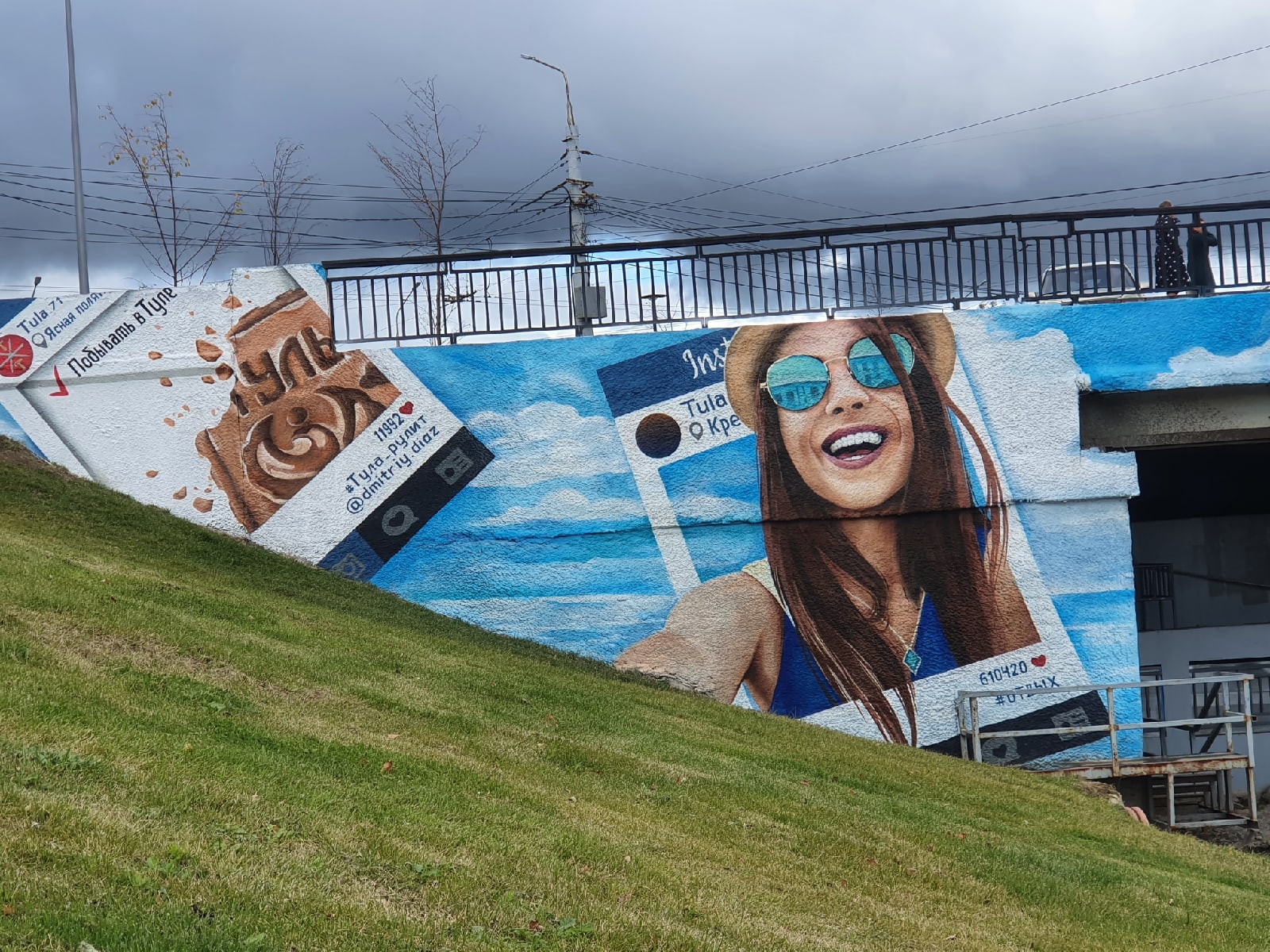 На Казанской набережной в Туле появилось новое граффити. Изображение нанесено на стену моста. Теперь прохожим улыбается девушка с телефоном в руках. А ее изображение окружают посты из соцсетей с фотографиями тульских брендов.