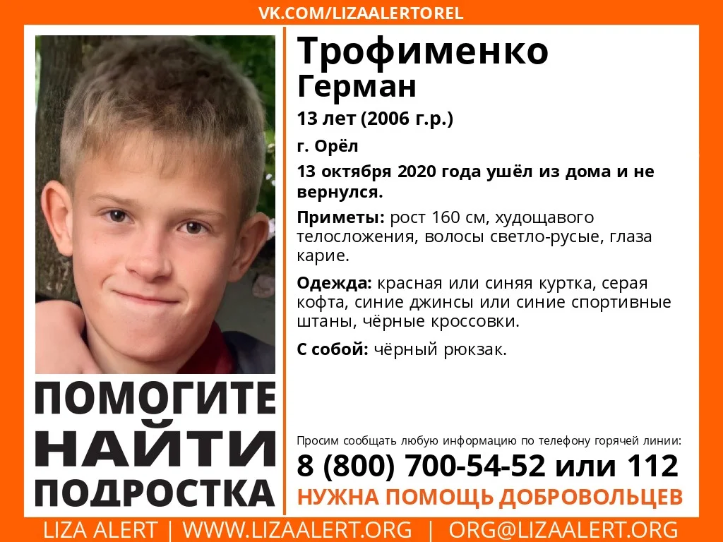 В Орле 13-летний мальчик Герман Трофименко ушел из дома 13 октября 2020 года и не больше не вернулся. К поискам подключились волонтеры отряда «Лиза Алерт». Сообщается, что подросток может находиться в Тульской области.