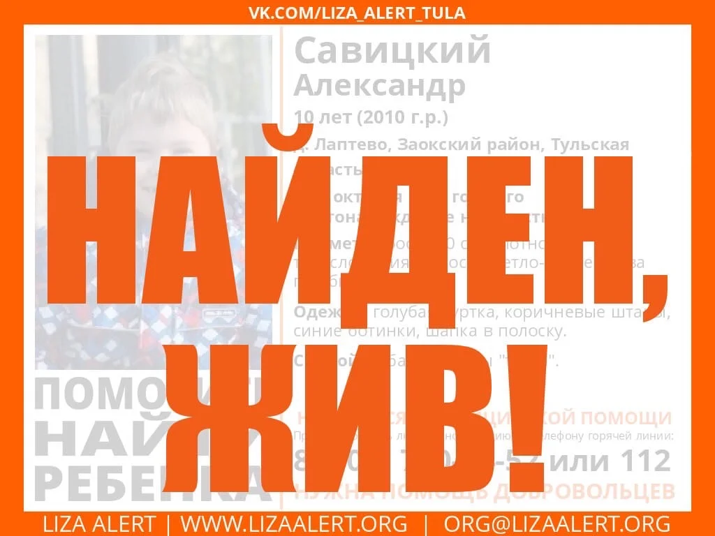 10-летний мальчик, потерявшийся в Заокском районе найден живым. Об этом сообщают волонтеры отряда «Лиза Алерт».