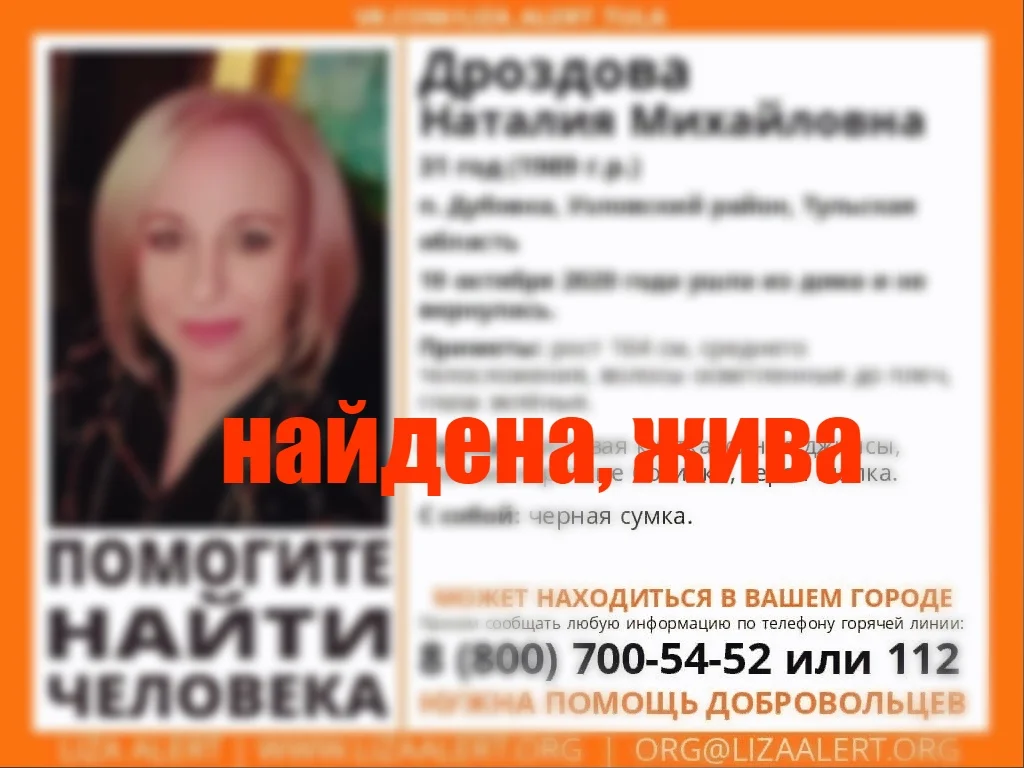 31-летняя женщина, пропавшая в Узловском районе, найдена живой.