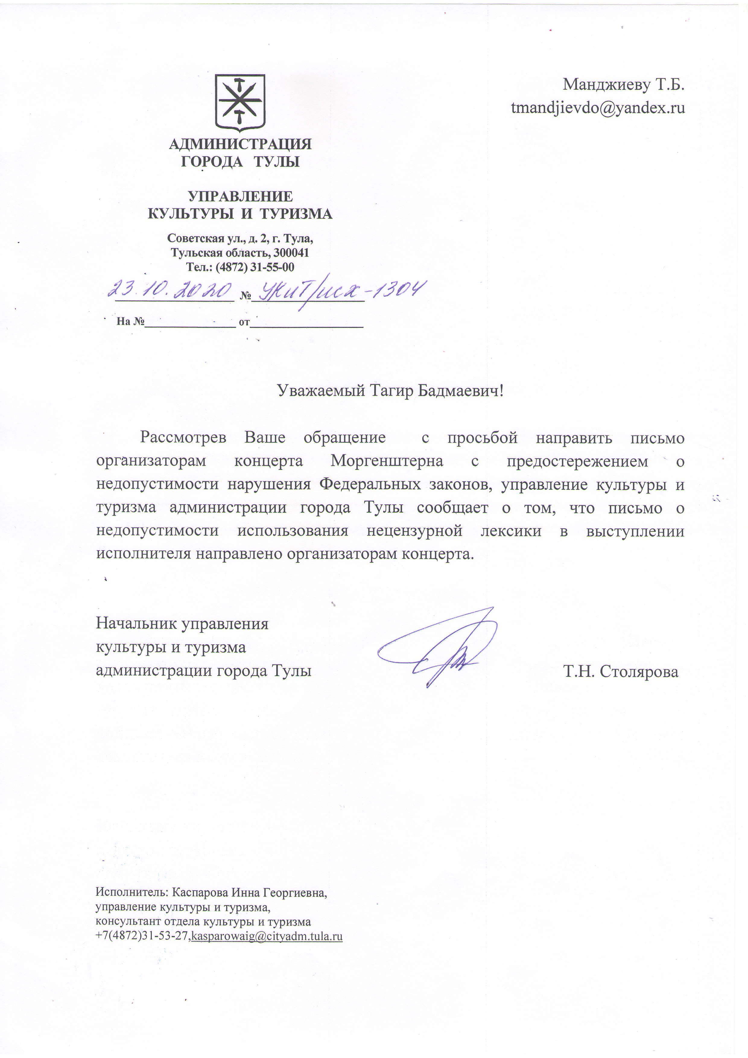 Обращение туляка без ответа не осталось. Стало известно, что управление культуры и туризма городской администрации направило жалобу напрямую организаторам концерта.