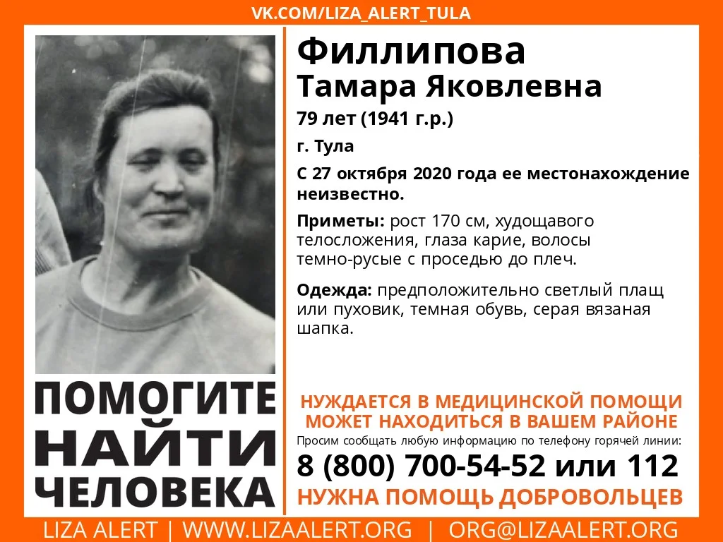 В Туле пропала 79-летняя пенсионерка Филлипова Тамара Яковлевна. С 27 октября ее местонахождение остается неизвестным.