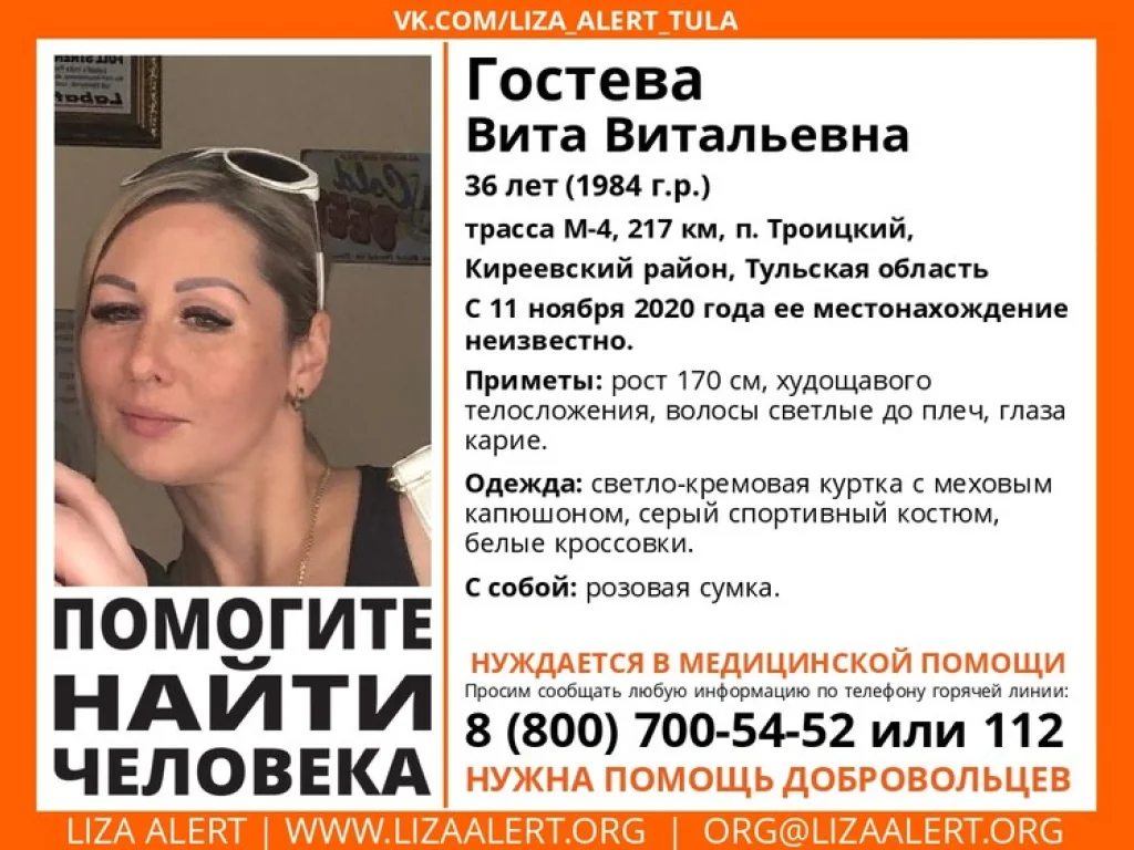 В Киреевском районе пропала 36-летняя женщина. Ее местонахождение остается неизвестным с 11 ноября. К поискам пропавшей присоединился поисково-спасательный отряд «Лиза Алерт».
