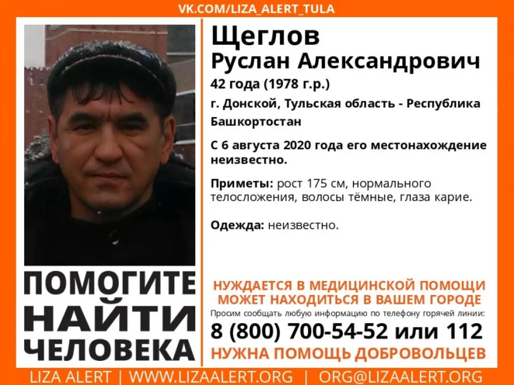 В начале августа в Донском пропал Щеглов Руслан Александрович 42 лет. Его безуспешно ищут почти 4 месяца.