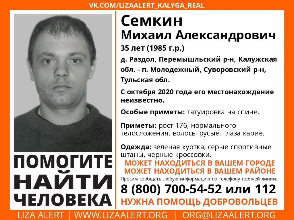В Калужской области пропал 35-летний мужчина. Его местонахождение остается неизвестным с октября 2020 года. Однако, сообщается, что пропавший может находиться в Тульской области.