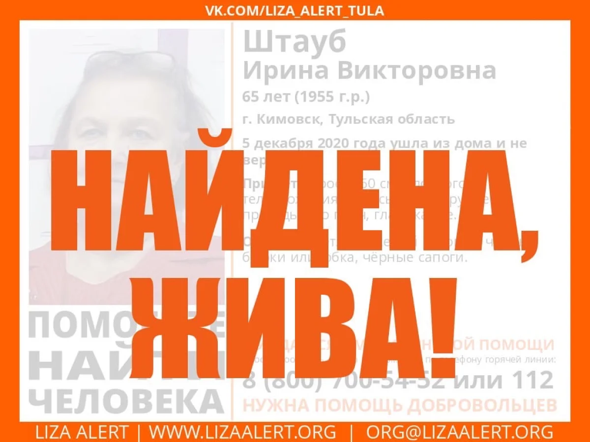 В Тульской области пропавшая 65-летняя женщина найдена живой