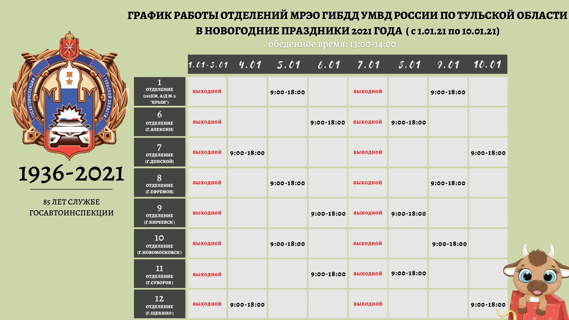 На новогодние праздники в МРЭО ГИБДД по Тульской области меняет график работы своих отделений отделений.