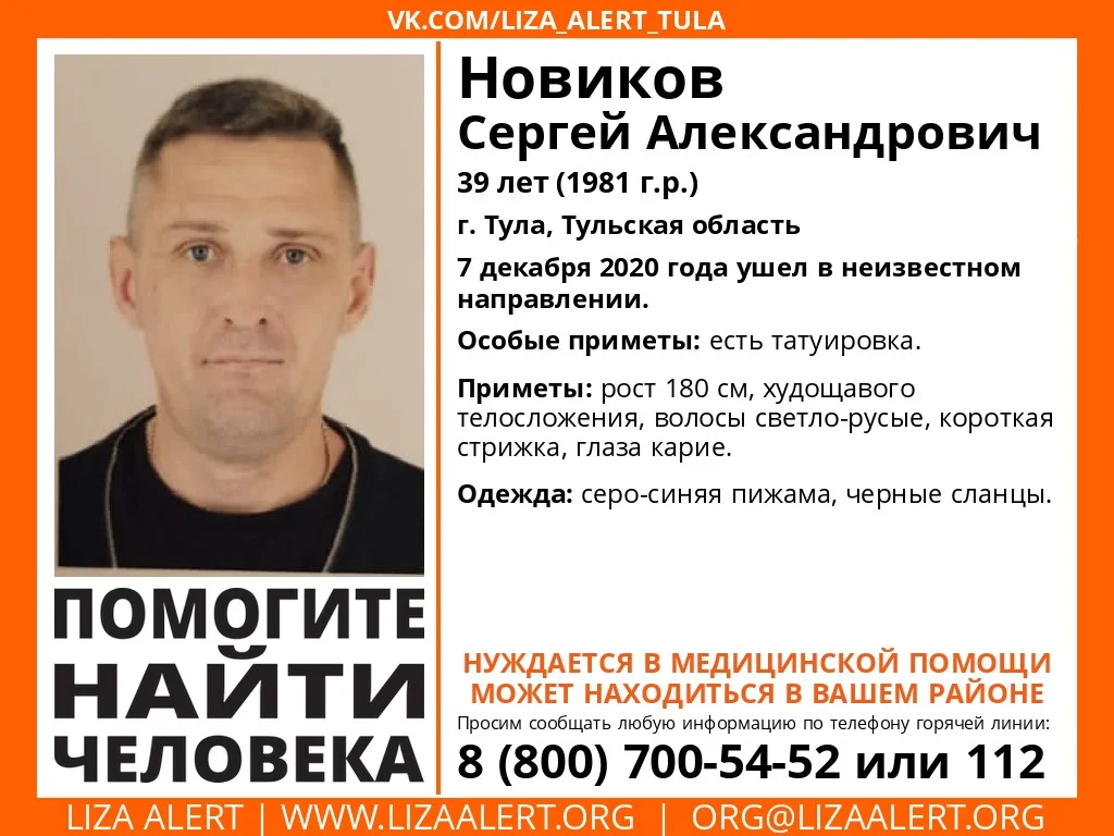 В Туле ищут пропавшего 39-летнего мужчину в сланцах и пижаме