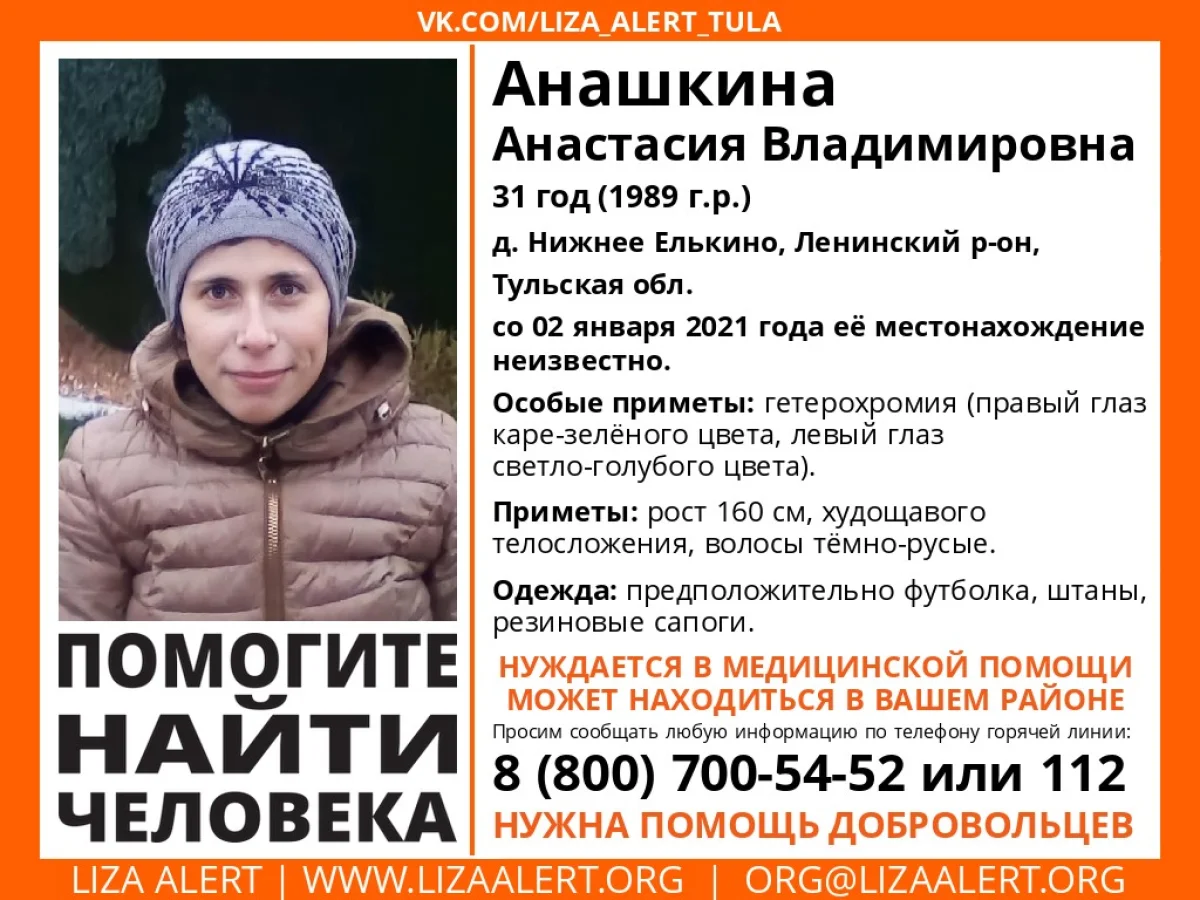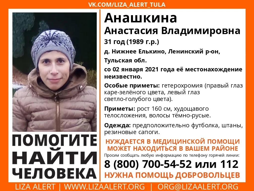 В Ленинском районе Тульской области в д. Нижнее Елькино пропала 31-летняя женщина. Со 2 января 2021 года ее местонахождение остается неизвестно.