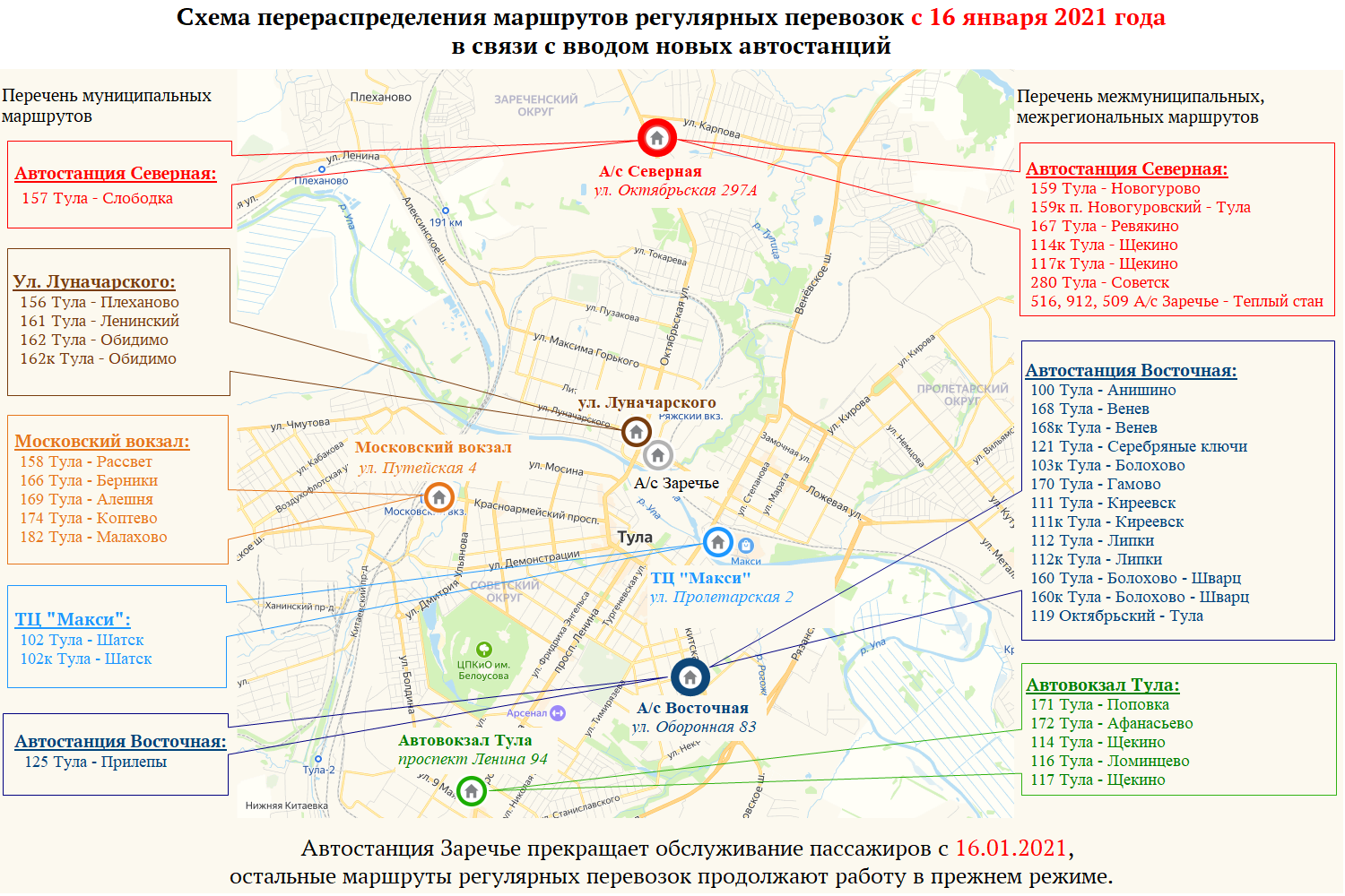 С 16 января в связи с закрытием автостанции «Заречье» в Туле начнут работу новые станции - «Северная» (ул. Октябрьская, 297-а) и «Восточная» (ул. Оборонная, 83).