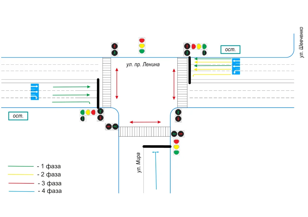 Чтобы увеличить пропускную способность и уменьшить количество ДТП на пересечении проспекта Ленина и улицы Мира установят дополнительную секцию светофора — левоповоротную стрелку.