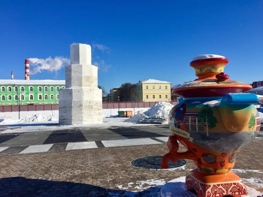 В скором времени скульптор придаст снеговику форму. Его раскрасят и дополнят одним из главных символов Тулы - гармонью.