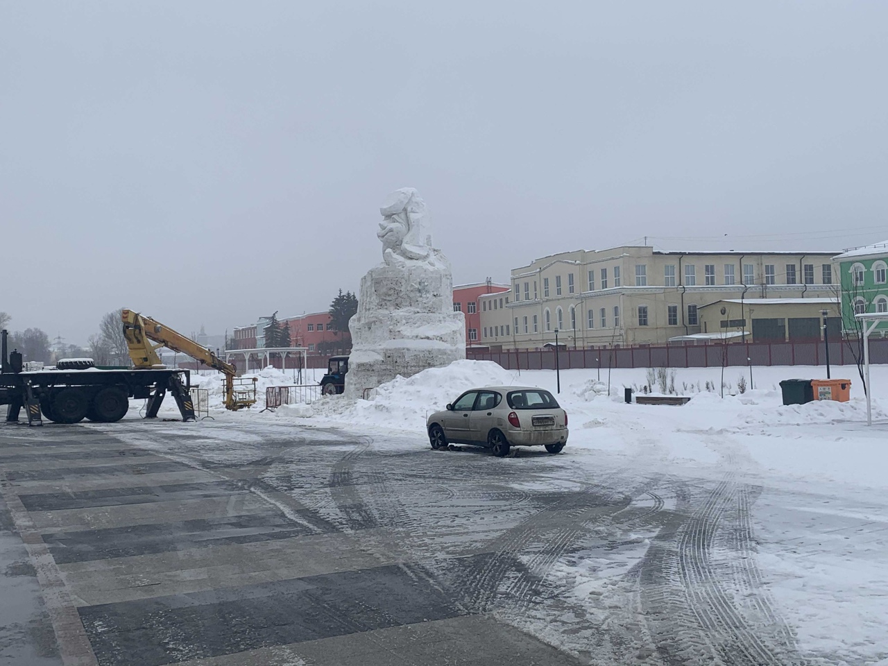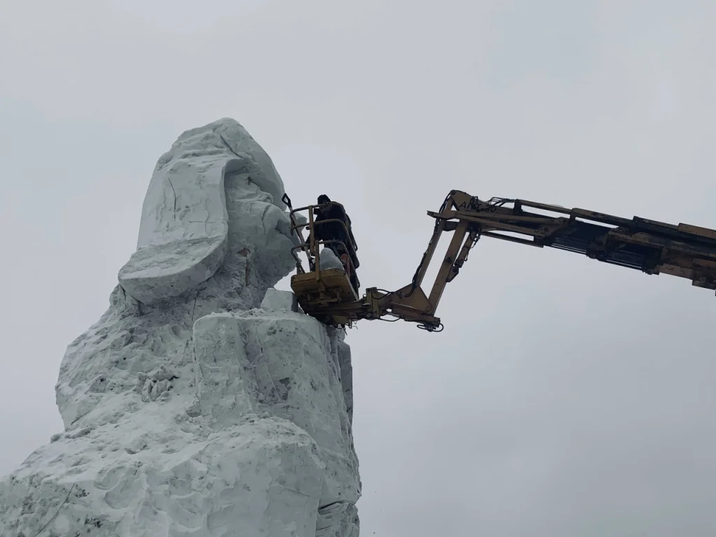 В Туле скульптор на Казанской набережной в центре города продолжает создавать зимнюю сказку. Снеговик немного подтаял из-за потепления, но даже во время дождя ведутся работы по его возведению. На месте строительства используется спецтехника. Снежные кирпичи режут бензопилой, а потом поднимают вместе со скульптором на высоту, чтобы уже на уровне головы снежного героя осуществить строительство.