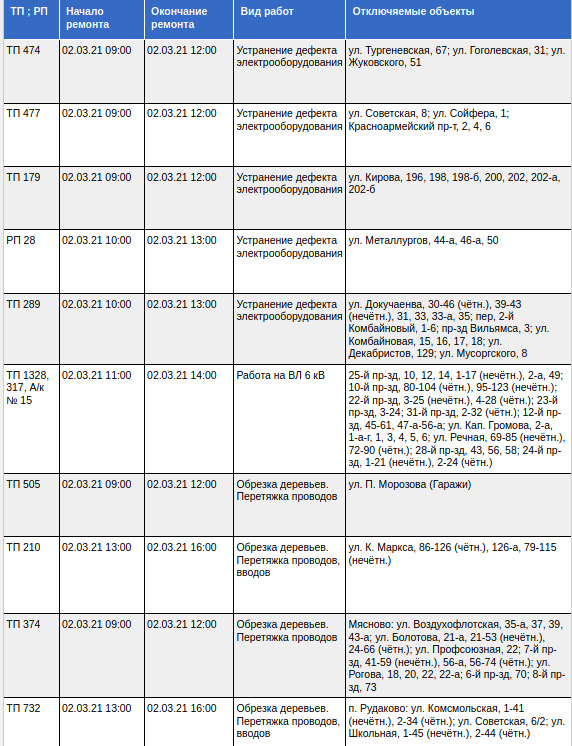Предстваляем полный список отключения электроэнергии в Туле на 2 марта:
