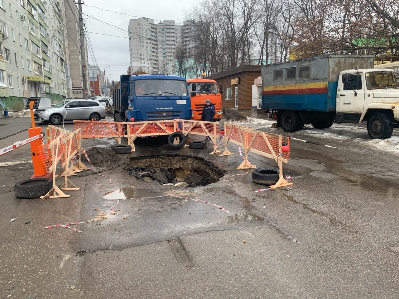 В Туле на улице Вересаева провалился асфальт и образовалась большая дыра: ведутся ремонтные работы