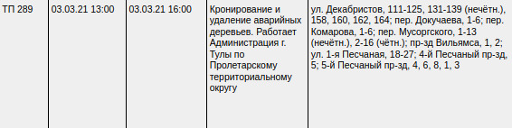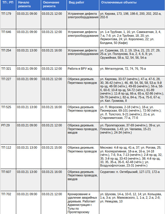 Предстваляем полный список отключения электроэнергии в Туле на 3 марта: