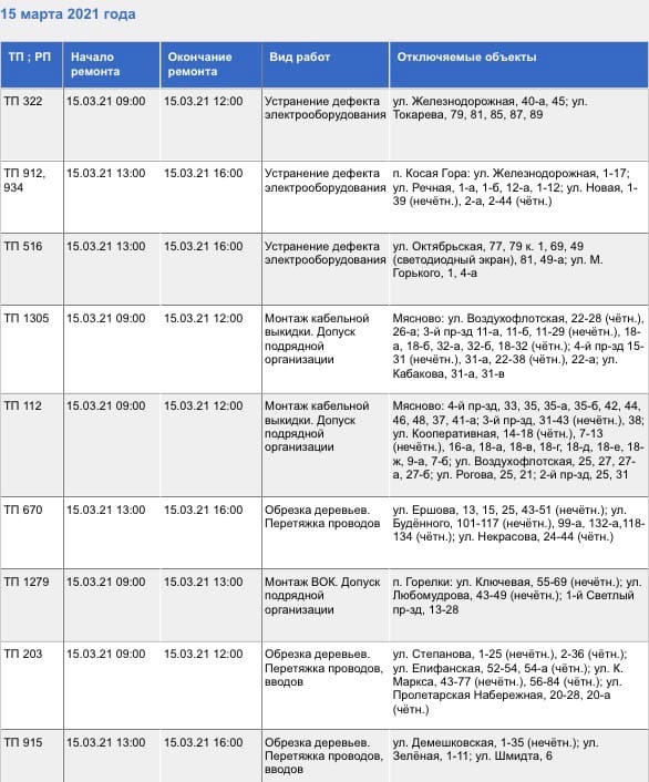 В понедельник, 15 марта, по ряду адресов в Туле временно отключат электричество. Такая мера будет принята из-за плановых ремонтных работ, связанных с обрезкой деревьев, перетяжкой проводов и прочим. Свет начнут отключать уже в 9:00, а к 16:00 работы будут полностью завершены, электричество вернется в дома.