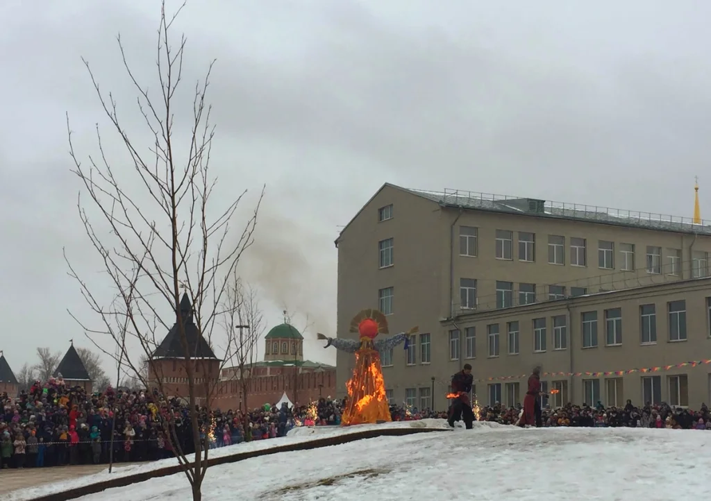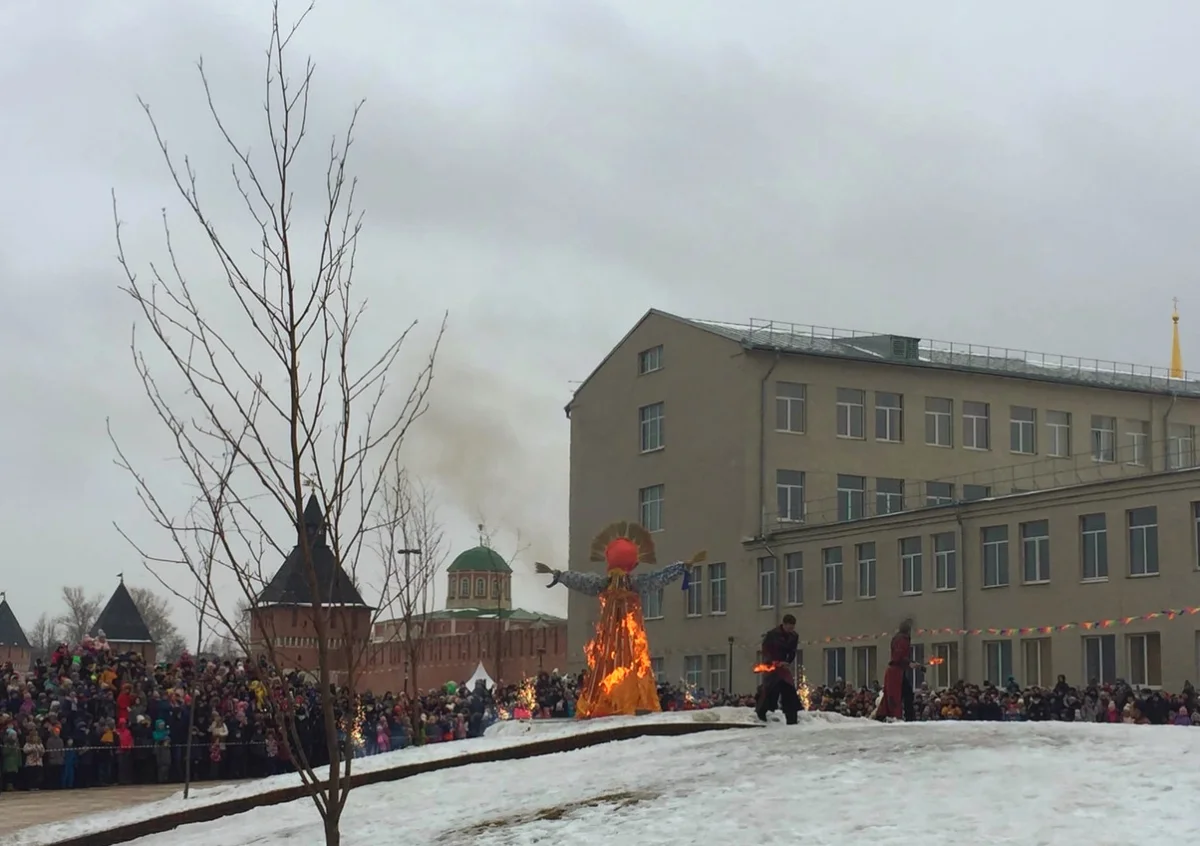 Множество людей с нетерпением ждали главного действия - сжигания чучела зимы. И в 15:00, к радости туляков и их детей, шоу со жгинаем чучела все же началось. Жители города ликовали, прощались с зимой и приветствовали весну!