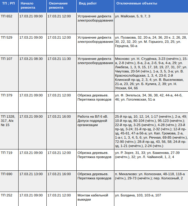 Представляем полный список адресов, по которым не будет электроэнергии 17 марта 2021 года: