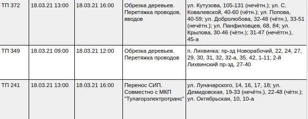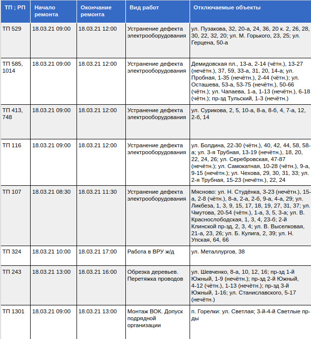 18 марта 2021 года на ряде тульских улиц будет отключено электричество. Отключения начнутся утром с 9:00 или 9:30, а по некоторым адресам и с 8:30.