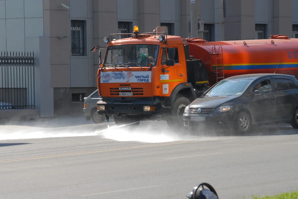 В связи с тем, что столбики термометров поднимаются выше отметки в +30С, руководство города приняло решение поливать магистральные улицы областного центра каждые два часа. В одну смену в городе работает от 12 до 16 единиц техники «Спецавтохозяйства» и «Профдорстроя».