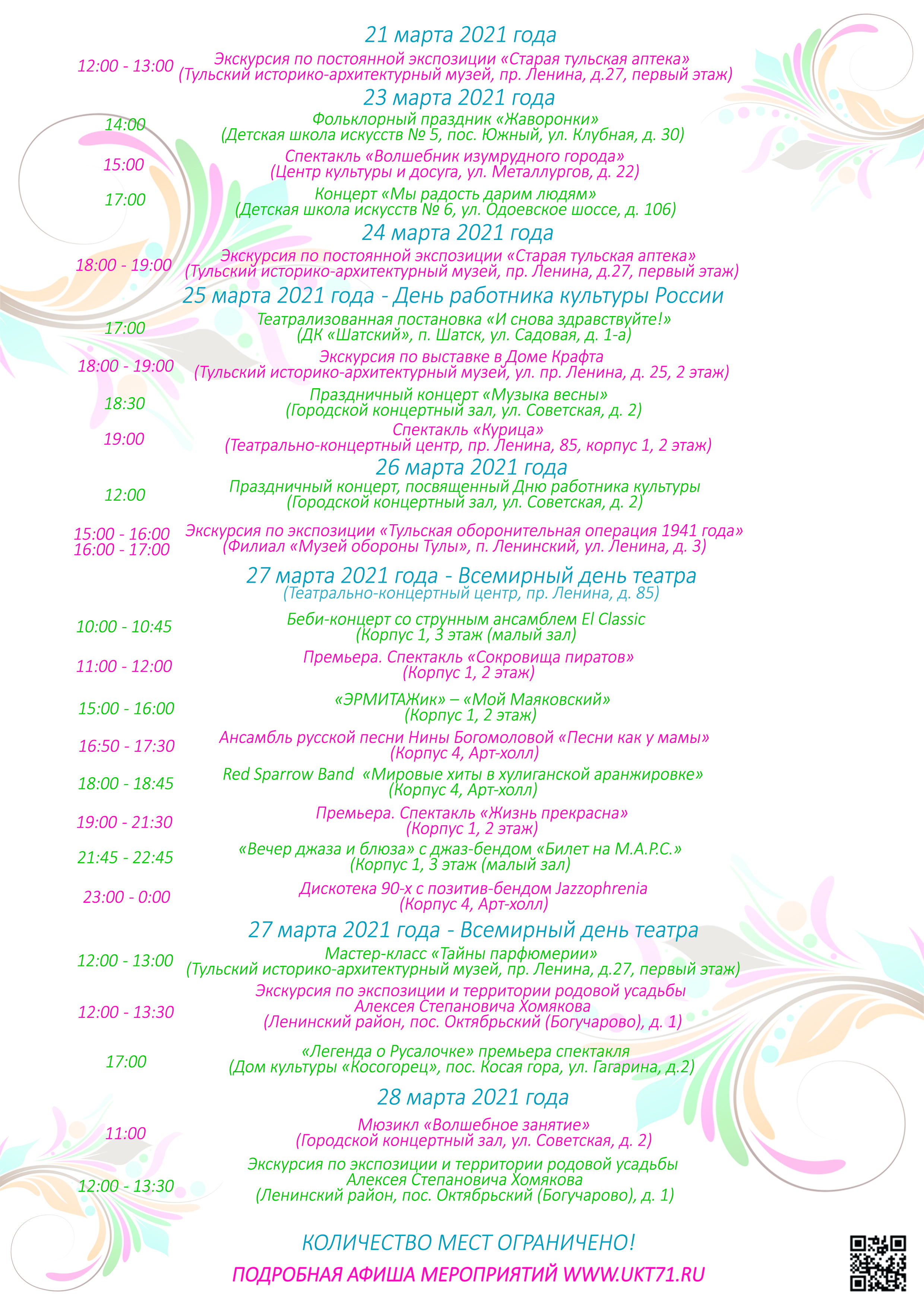 Неделя культуры приурочена к празднованию Дня работника культуры России, который отмечается 25 марта. Всю неделю, начиная с 21 марта, в Туле проходят мероприятия, приуроченные к этому событию.