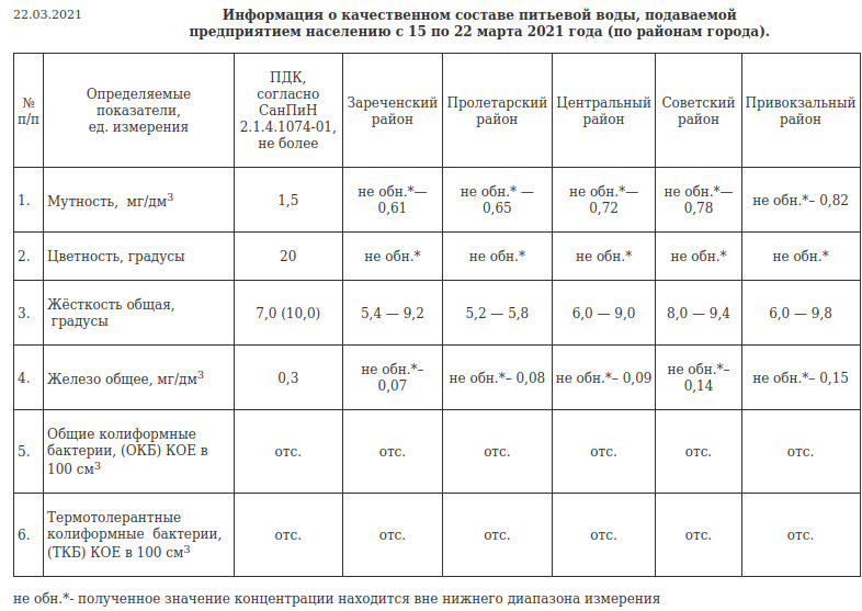 Предоставляем таблицу с информацией о качественном составе пьевой воды по райнам города с 15 по 22 марта 2021 года: