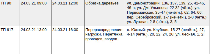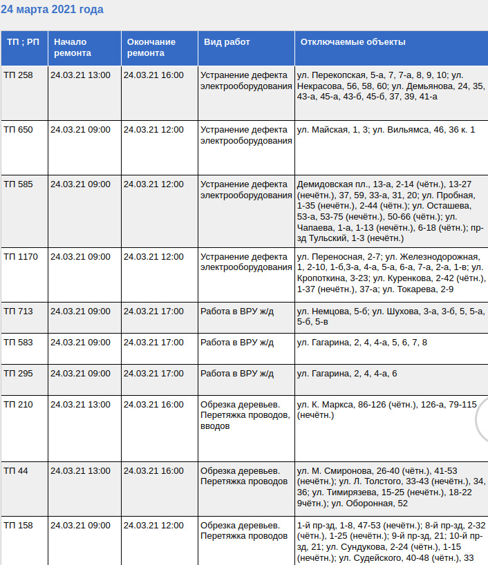 Электричество будет отключено 24 марта по следующим адресам: