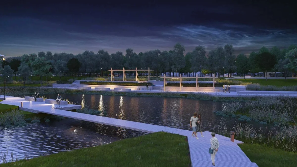 Проект «Липки-рестарт» предполагает благоустройство набережной с мостиком, скамейками и современным освещением. На месте фонтана появится световая инсталляция.