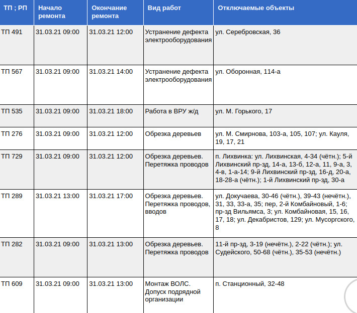 Представляем список адресов, где не будет электричества 31 марта: