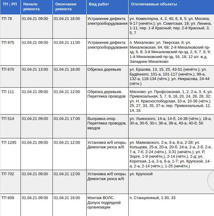 Представляем полный список адресов, на которых по сообщению «Тульских городских электрических сетей» не будет электричества 1 апреля 2021 года: