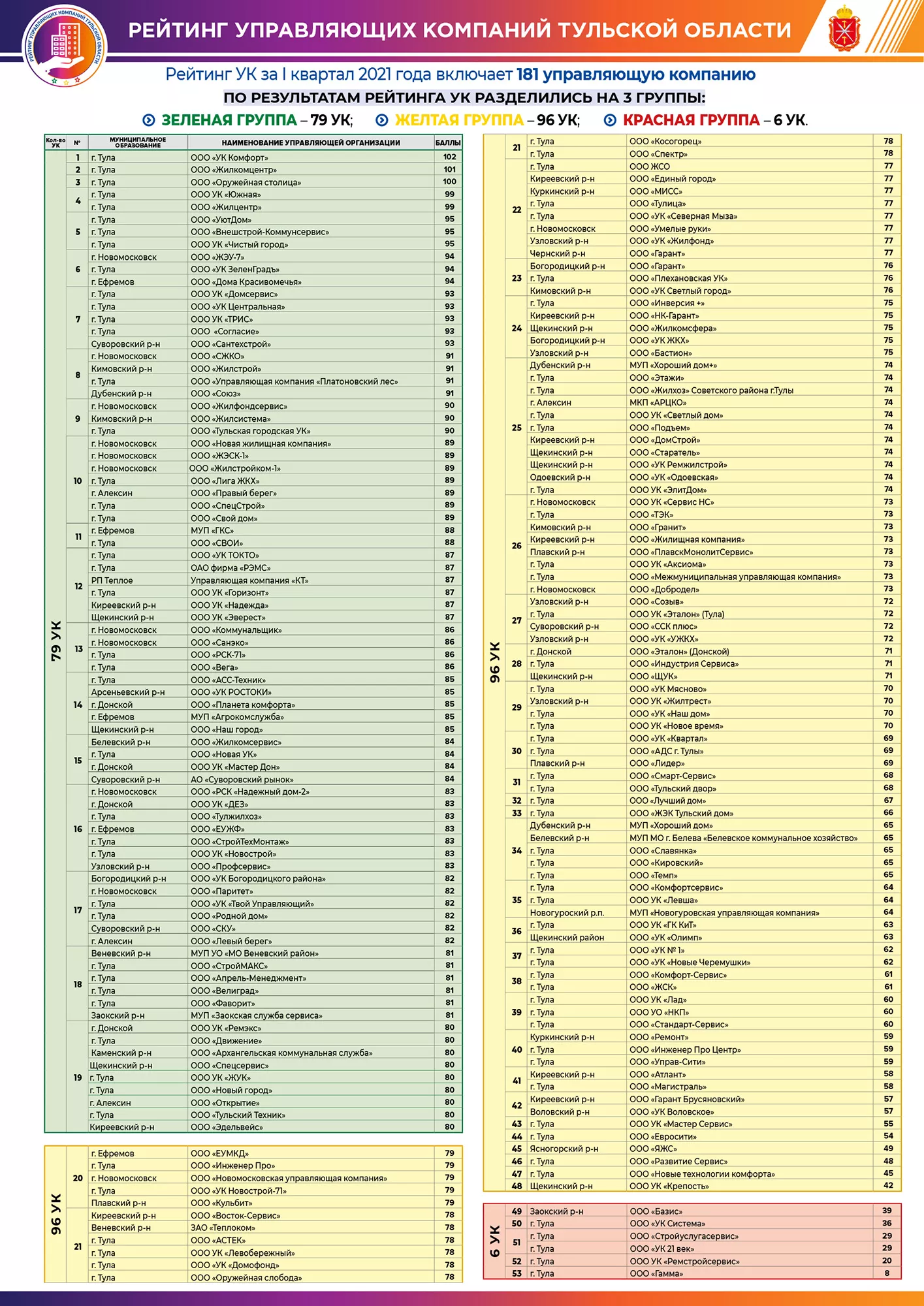 12 мая на брифинге для СМИ презентовали очередную редакцию рейтинга управляющих компаний (УК) Тульской области по итогам работы в первом квартале 2021 года. В рейтинг вошла 181 управляющая организация. Как обычно, они были разделены на три зоны. В «зеленой» зоне оказались 79 УК, в «желтой» — 96, в «красной» — 6.