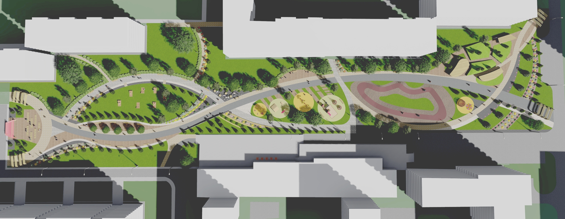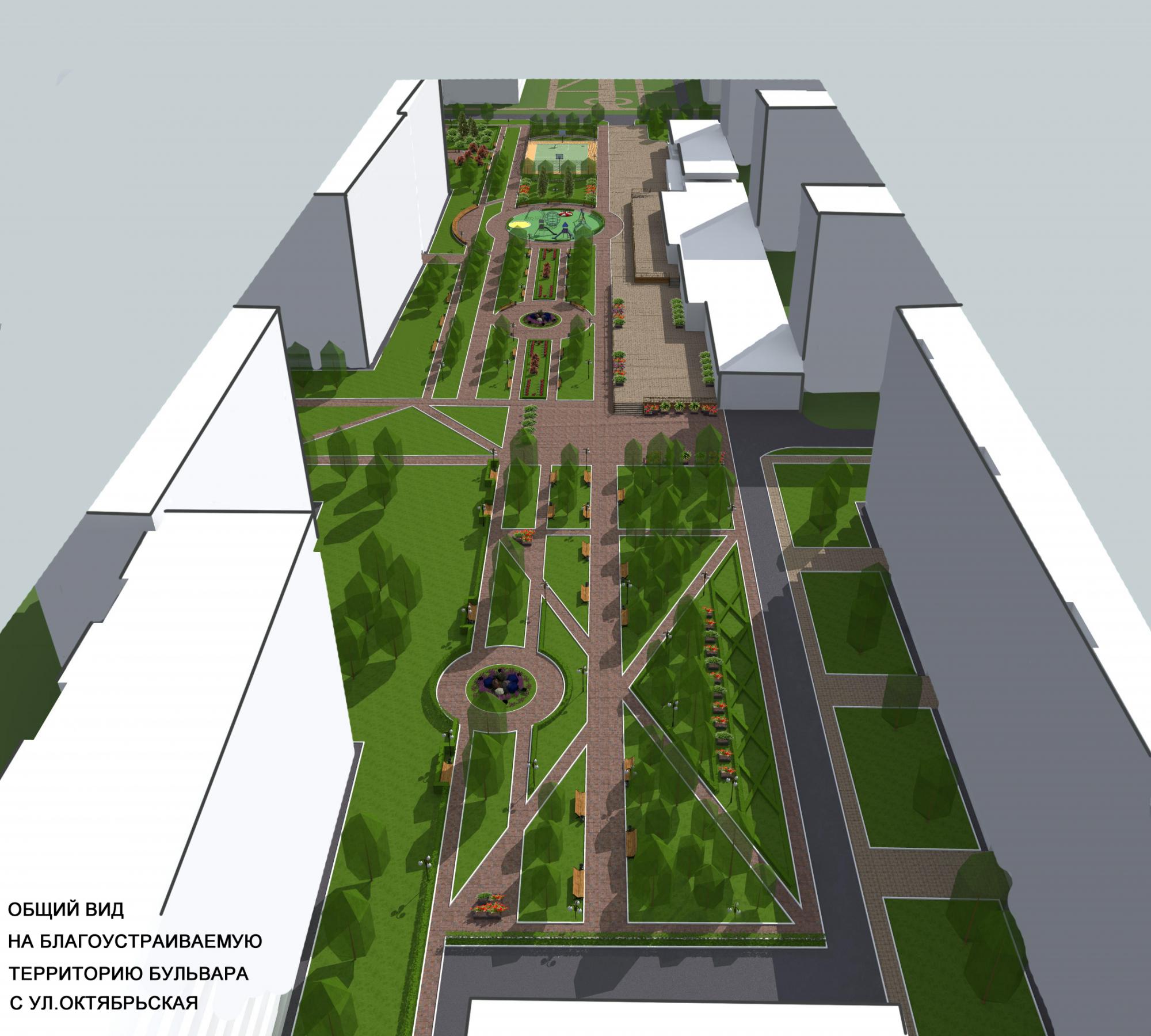 Проектом предусмотрено устройство центральной аллеи с клумбами и зонами отдыха, установкой скамеек и урн, арт-объекта, парковых светильников, озеленение и высадка живых изгородей.