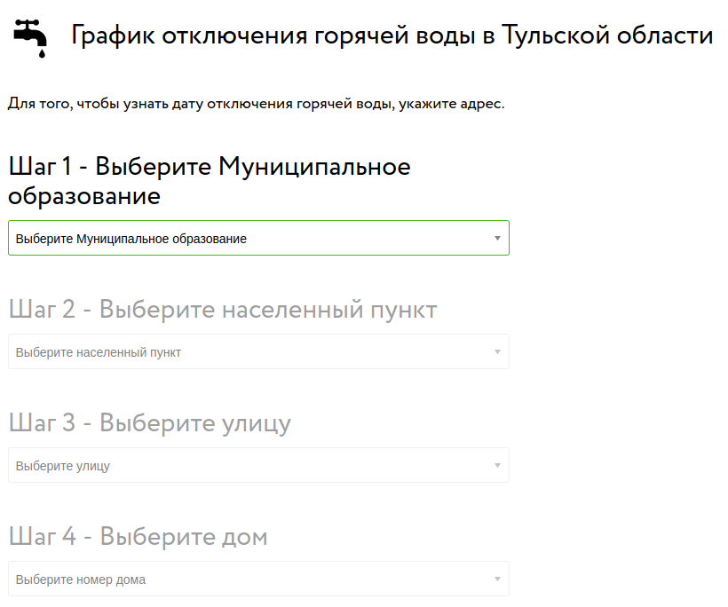 Специальный сервис для уточнения графика отключений по горячему водоснабжению запустили на сайте региона в специальном разделе. Чтобы увидеть график, достаточно выбрать адрес в специальных полях: