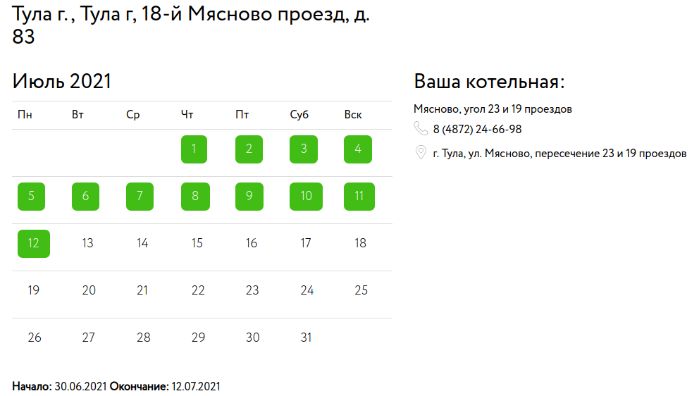 После чего сервис сформирует календарь с датами отключения, а также покажет телефон и адрес котельной, к которой относится выбранный дом:
