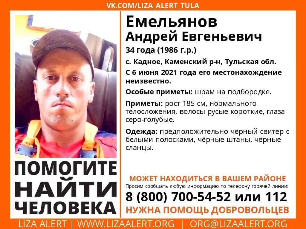 В Тульской области пропал 34-летний мужчина. Андрей Евгеньевич Емельянов родом из села Кадное Каменского района Тульской области, с 6 июня 2021 года его местонахождение неизвестно.