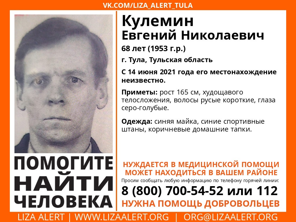 В Туле ищут пропавшего Евгения Николаевича Кулемина, 68 лет. О его местонахождении также ничего неизвестно с 14 июня2021 года. Пропавший - мужчина ростом 165 см, худощавого телосложения, глаза серо-голубые, волосы русые, короткая стрижка. Был одет в синюю майку, синие спортивные штаны, коричневые домашние тапки.